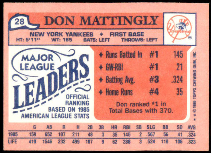 1986 Topps Don Mattingly League Leaders Minis (#28)