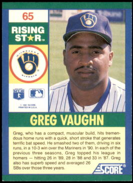 1991 Score 100 Hottest Rookies Greg Vaughn (#65)