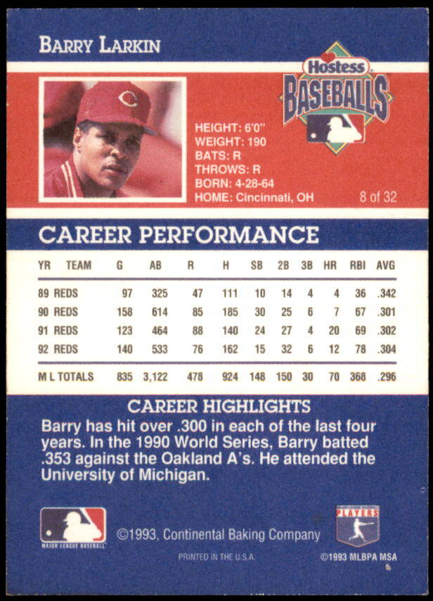 1993 Continental Baking Hostess Baseball Barry Larkin (#8)