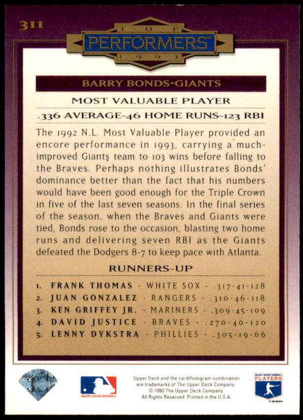 1994 Upper Deck Collector's Choice Barry Bonds Top Performers Silver Foil Signature (#311)