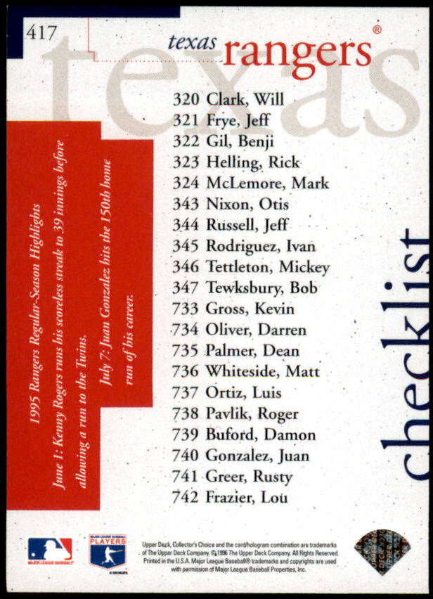 1996 Upper Deck Collector's Choice Juan Gonzalez Team Checklist (#417)