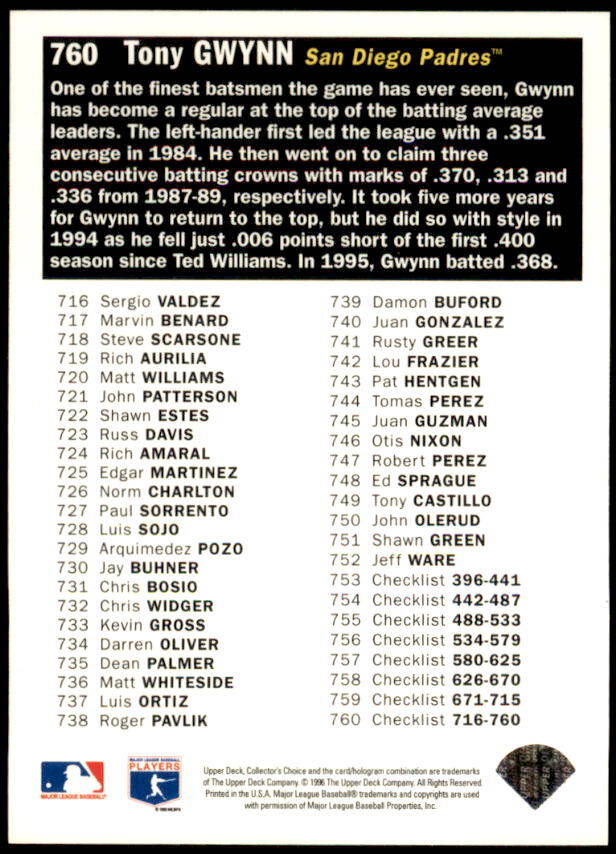 1996 Upper Deck Collector's Choice Tony Gwynn Checklist (#760)