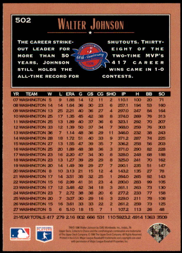 1996 Upper Deck Collector's Choice Walter Johnson First Class (#502)