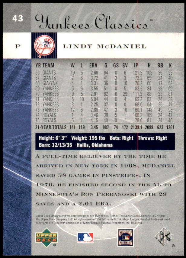 2004 Upper Deck Yankees Classics Lindy McDaniel (#43)