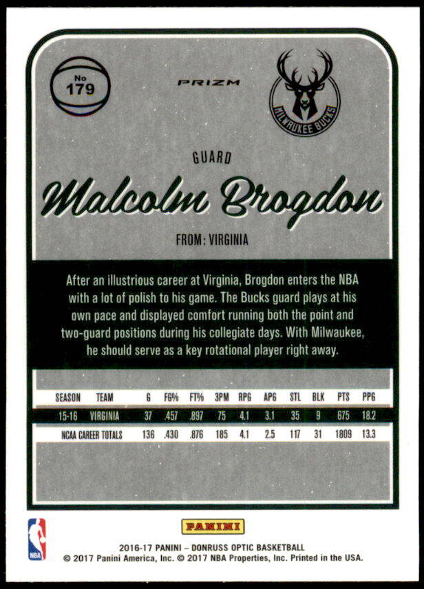 2016 Donruss Optic Malcolm Brogdon Rookie Purple Prizm (#179)