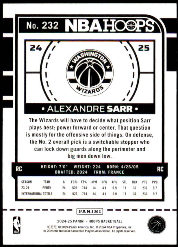 2024 NBA Hoops Alexandre Sarr Rookie (#232)